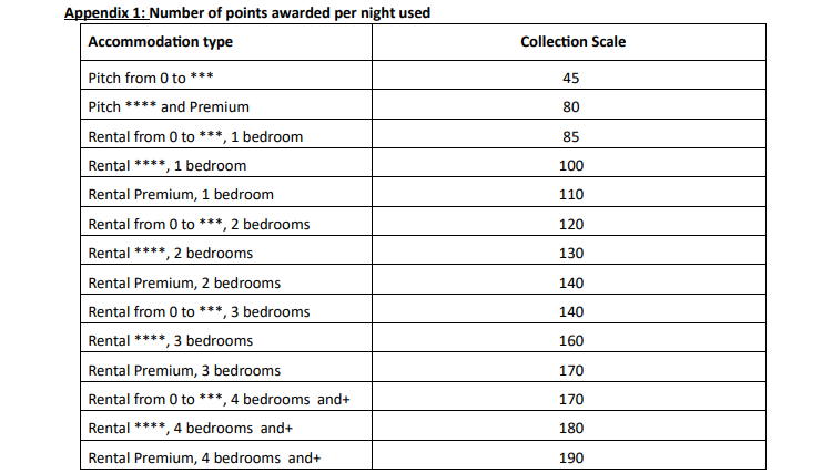 The number of points awarded depends on the number of nights booked, payed and the type of accommodation, according to the scale below: