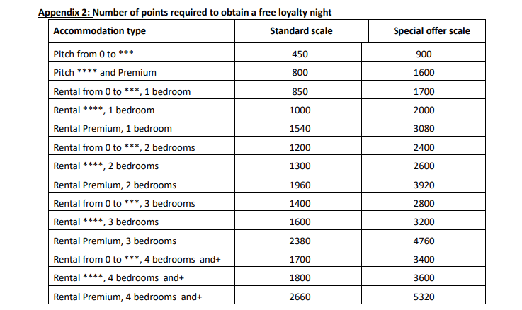 Once you have collected enough points, you can use them to book free nights, only outside of July/August and during the French school holidays at Christmas and during the winter holidays, at participating Yelloh! Village campsites. In the case of special offers, free loyalty nights may be suggested during periods that are usually excluded, on certain dates and at certain camping villages. In this case, the number of points required for a free night will be doubled compared to the Standard Scale.